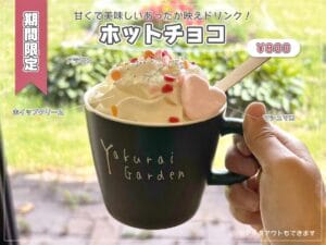 やくらいガーデン内にあるカフェでは、香り豊かなコーヒーなどのドリンクメニューだけでなく、